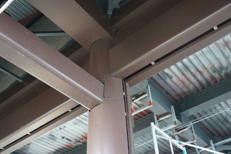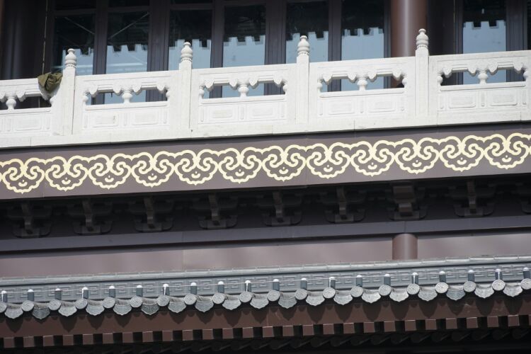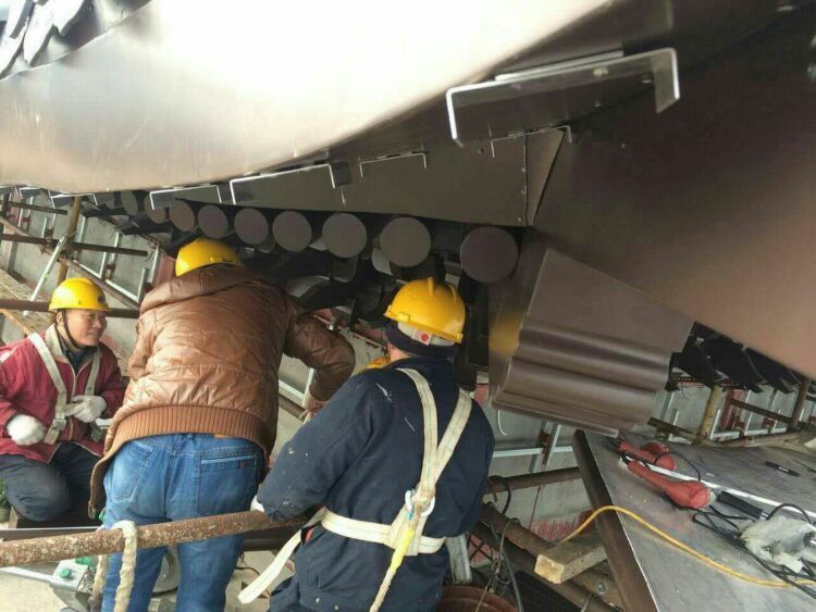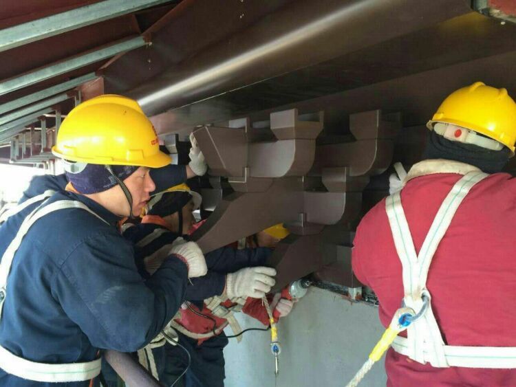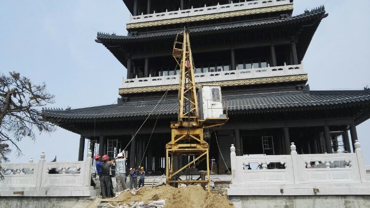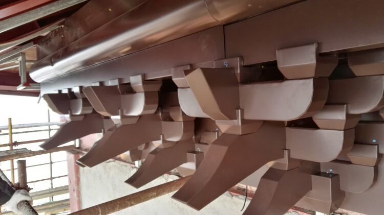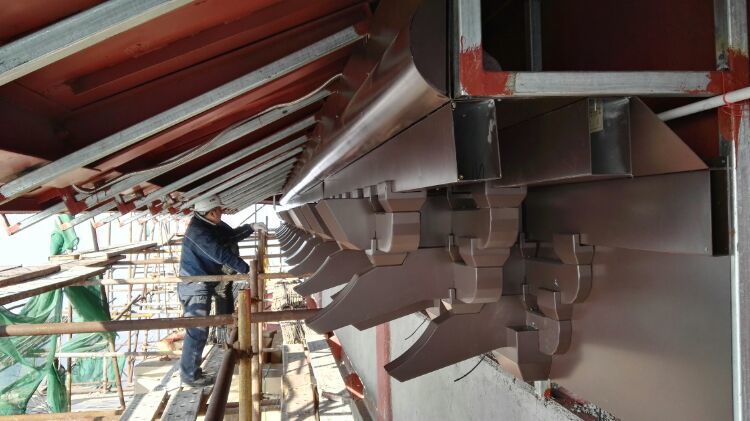 鋁板包柱及額枋安裝,用鋁板在工廠加工好,用現代幕墻施工技術安裝,每個柱枋按古建模數要分解成加工圖紙,確保同現場一致。