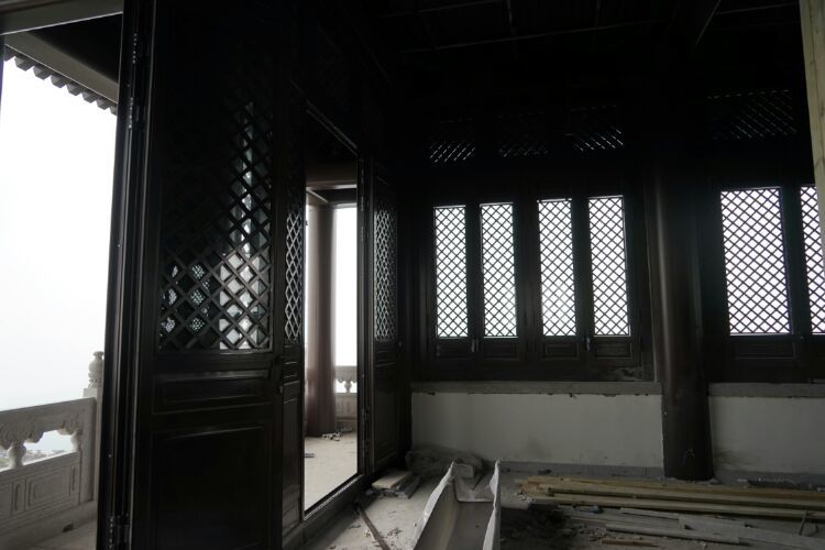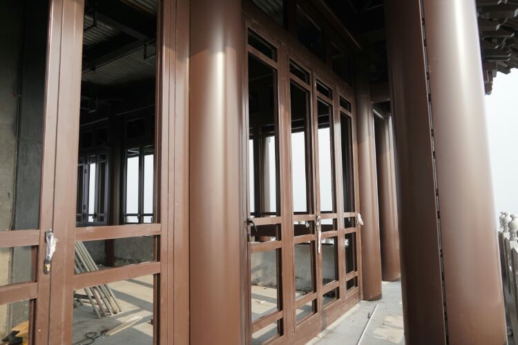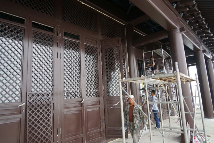 鋁合金門窗安裝,用鋁合金門窗型材做4米多高的門窗,中空玻璃,花格也是用鋁合金開榫組合而成,解決了傳統木門窗容易變形開裂,及密封不嚴等問題