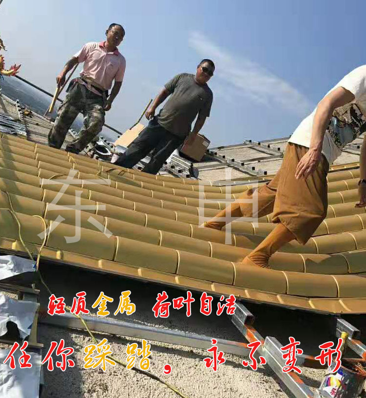仿古瓦瓦片是一個時代的主旋律,它像守護神一樣,在千家萬戶的屋頂上遮風擋雨,保衛家園。東申瓦業主要生產一體仿古瓦以及一體仿古鋁瓦,東申金屬瓦的重量較輕,是傳統瓦片的十分之一,但重量輕不代表質量不高,東申仿古瓦具有較高的韌性,人送外號“質輕高強小天使”。有人曾經做過這樣一個實驗:將瓦片一端墊高,使之成為一個斜坡面,兩名成年男子站在瓦片上跳動,瓦片完好無損,它擁有比傳統瓦片更強的堅固性,同時比傳統瓦片的單張面積大,更易于安裝,將瓦片用不銹鋼龍骨底層,上面用螺絲釘,焊接固定即可,瓦片整齊排列,賞心悅目,有一種自帶整體的既視感,令人不忍挪開視線,東申一體仿古瓦,擁有“荷葉自潔”功能,源于表面涂刷的氟碳漆,市場上最具有自潔功能的涂料,時刻保持潔凈.