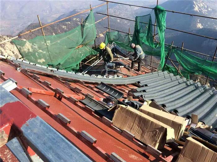 2.屋面結構的整體安裝方式相比較傳統(tǒng)屋面瓦發(fā)生了根本上的創(chuàng)新,傳統(tǒng)的仿古屋面結構采用木頭搭接底層,安裝的時候需要很多的工序和工人來搬運瓦片,整個的屋面安裝周期比較長,還必須是好天氣;