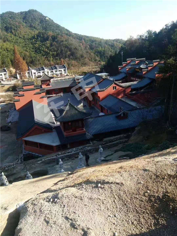 2019年12月2日湖北黃梅縣老祖寺掛笠庵整體屋面全部采用東申仿古金屬瓦裝飾屋面;3#分體瓦,面積約1061.7平方米;整體外觀質感亮麗,彰顯高端氣質;