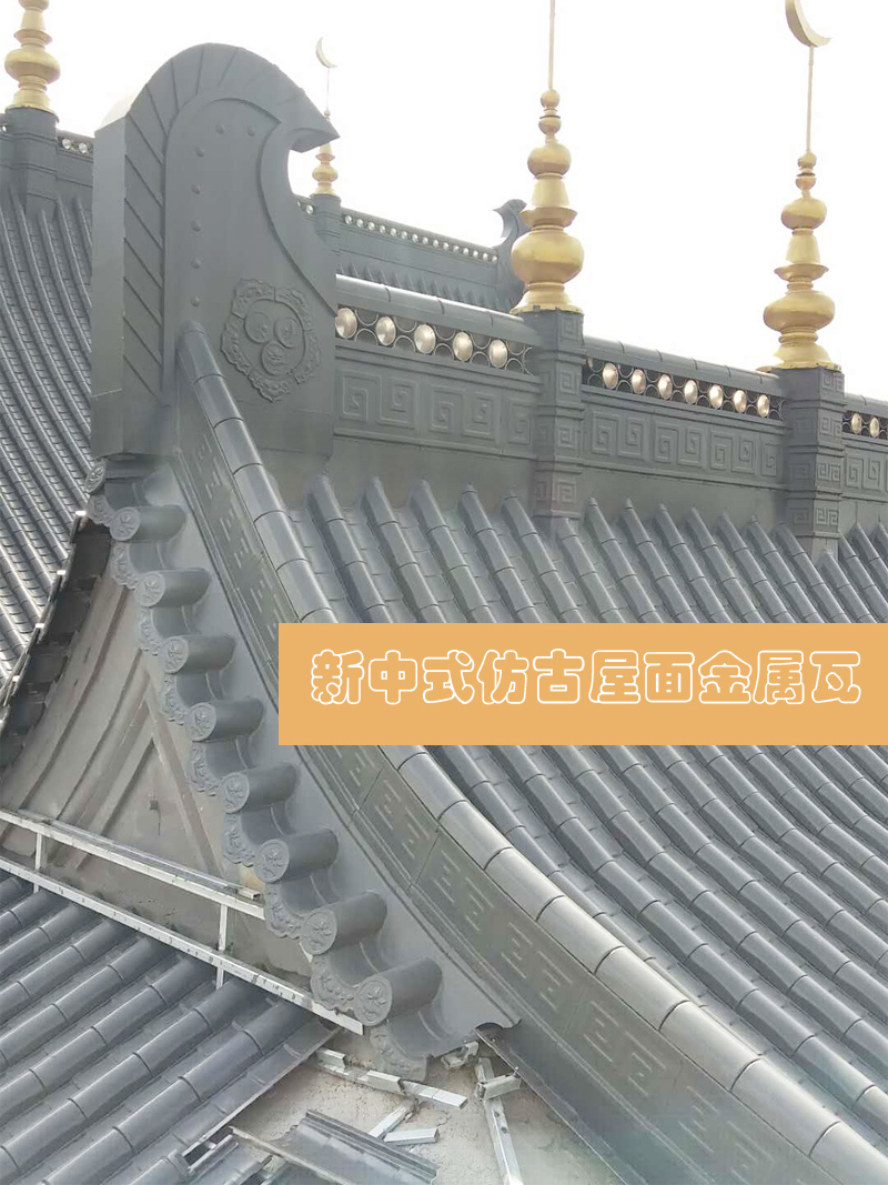 新中式仿古屋面金屬瓦在西寧,甘肅,這些地區的一些清真寺屋面已經開始使用,清真寺的人員也已經認可中式仿古屋面的這種風格和瓦型,針對屋面改造來選用相應的瓦片;
