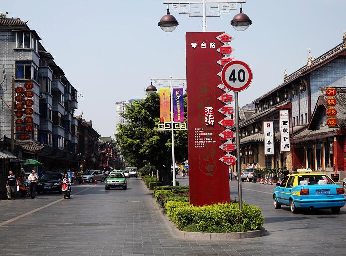 琴臺路處在成都市古建筑比較密集、文化氣息比 較濃厚的地段,周圍有杜甫草堂、青羊宮、百花潭、文化宮等古文化遺址及公園。周邊建筑即使是現代商業建筑業多以坡屋頂造型、素色著色。琴臺路 既很好 的融入這樣一片祥和的古文化氛圍中,又充分體現了自身的特點。這里最富特色的是全長920余米、橫貫整條街道的漢畫像磚帶,這條磚帶薈萃了中國目前面世的絕大部分漢畫像內容,游人隨磚帶前行,宴飲、歌舞、弋 射、車馬出巡等2000多年前漢代人的社會現實圖景和理想天堂便復活在游人的視線中。 這條磚帶由16萬塊天然青石磚鋪筑而成,仿真程度之高,令人叫絕。