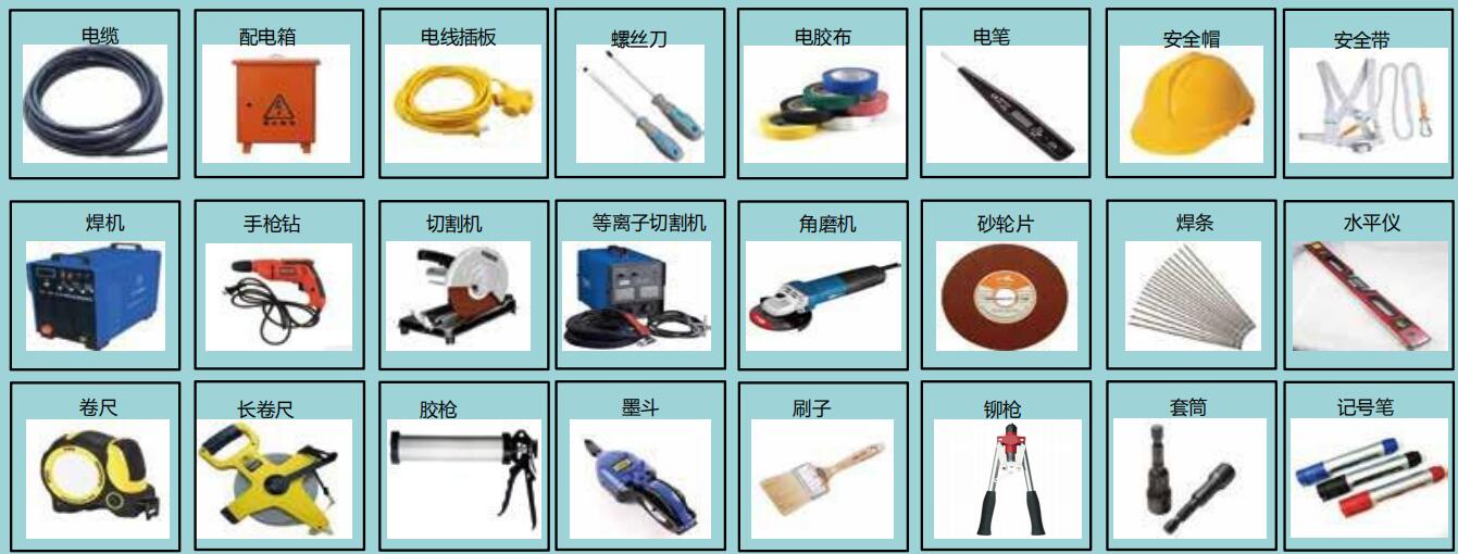 安裝及后期處理的工具有焊機,手槍鉆,切割機,等離子切割機,角磨機,砂輪片,焊條,水平儀,卷尺,長卷尺,膠槍,墨斗,刷子,鉚槍,套筒,記號筆等等;