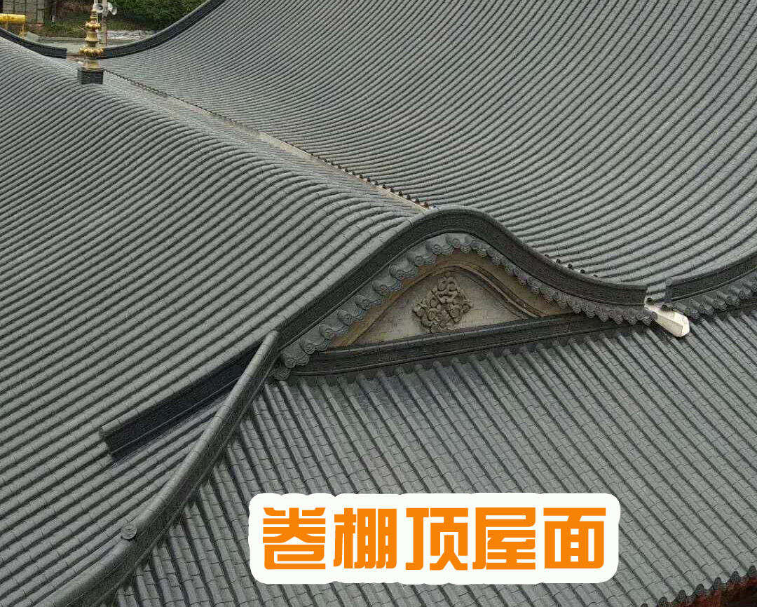 卷棚式屋頂,又稱元寶頂,是古代中國(guó)建筑的一種屋頂樣式。為雙坡屋頂,兩坡相交處不作大脊,由瓦壟直接卷過(guò)屋面成弧形的曲面,卷棚頂整體外貌與硬山、懸山一樣,唯一的區(qū)別是沒(méi)有明顯的正脊,屋面前坡與脊部呈弧形滾向后坡,頗具一種曲線所獨(dú)有的陰柔之美。根據(jù)左右山墻的懸山式和硬山式不同,卷棚頂可分為懸山卷棚、硬山卷棚、歇山式卷棚。