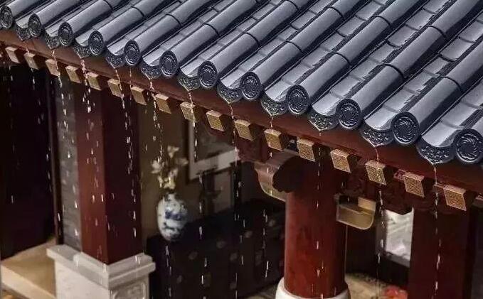滴水瓦,一種中式的瓦,可以保護(hù)墻壁的潔凈。一端帶著下垂的邊兒,底瓦于檐口處,其下端有下垂之圓尖形瓦片,蓋房頂時(shí)放在檐口,在燒制之前,會(huì)被繪上植物或者花卉的線條。