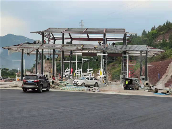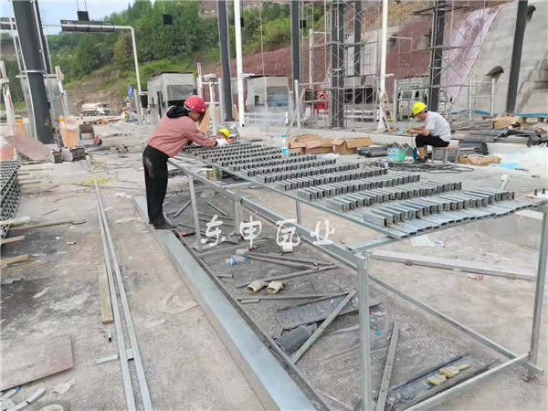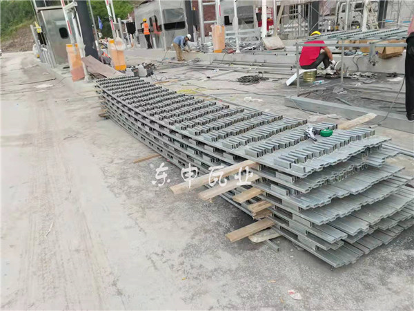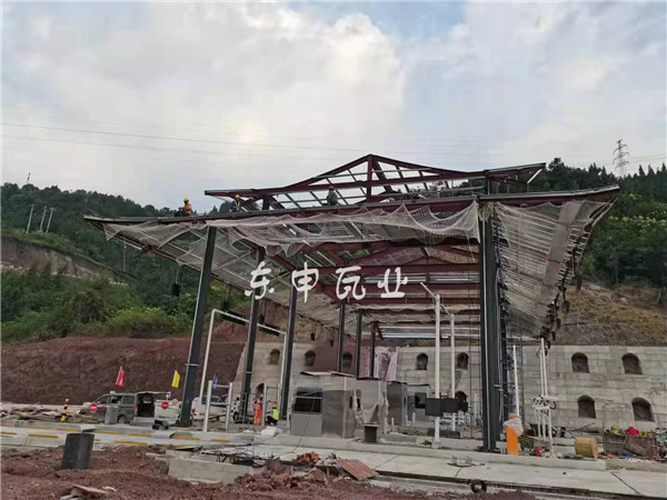 重慶收費站屋面金屬瓦項目工程正在安裝施工中,主要采用東申鋁瓦,2號分體瓦,厚度1.2mm,顏色:灰色;新中式仿古風格;采用明清荷花,瓦當滴水圖案;總共收費面積約2600平方米。新中式仿古風格,采用明清荷花,瓦當滴水圖案;彰顯整體收費站風采。