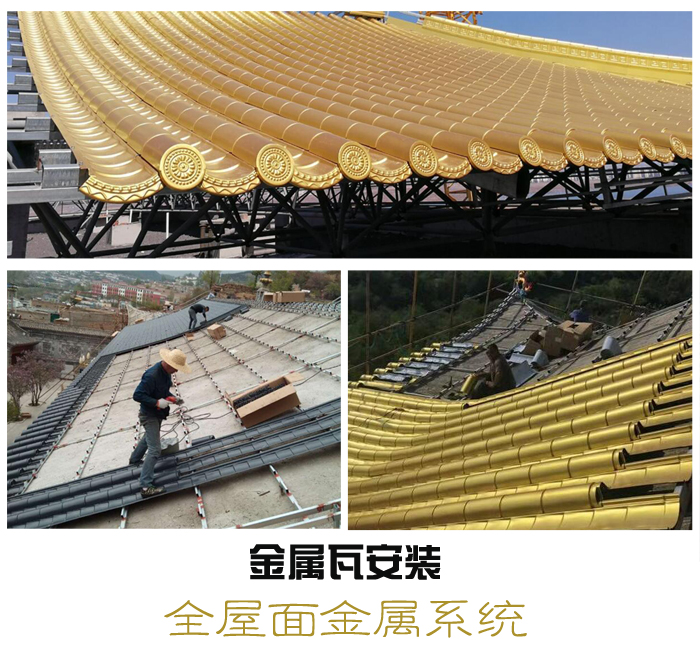 然后,鋁制仿古瓦獨特的安裝方式;整個屋面不管是混凝土底層,還是鋼結構,又或者是木質結構;對于鋁制仿古瓦的安裝來說,采用全屋面金屬系統干掛瓦形式安裝,底層焊接預埋件與上層的熱鍍鋅方管連接,龍骨上打螺絲掛瓦;安裝效率高,速度快;鋁制仿古瓦重量輕,耐久性強,相當于整個屋面的原材料發生了根本性的變化,連接焊接方式可維持的穩固性和長久性。
