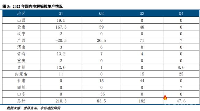 據愛擇咨詢統(tǒng)計, 2022年4月份國內原鋁產量為332.24萬噸,較上月減少5.12萬噸,同比上漲1.33%,年化產量4042.25萬噸,在產產能創(chuàng)歷史新高。其中Q1復產產能在210.3萬噸,Q2復產產能將近83.5萬噸,上半年復產產能近300萬噸,供應壓力明顯。且下半年仍有229.6萬噸產能計劃復產。