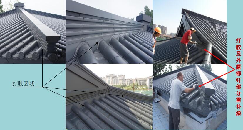 打膠補漆是最后屋面瓦處理細節的,每次在發貨的時候,廠區都會給免費送一桶油漆,用于補漆來使用;在正當溝和屋脊鏈接的地方要多打一點膠,免得后期漏雨。