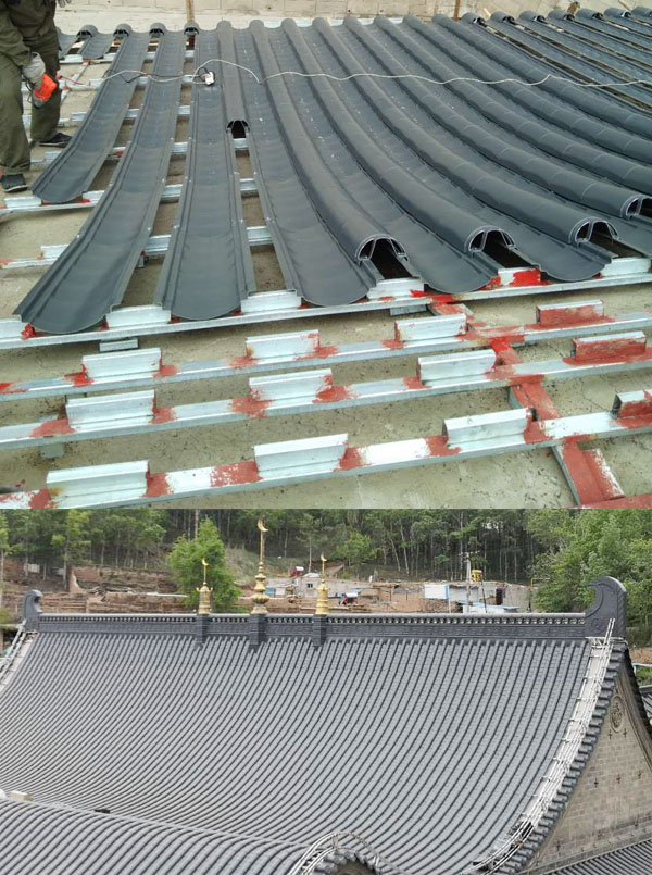 在下面看看安裝方面,對(duì)于金屬瓦的安裝,不同于普通的陶瓦,樹脂瓦,琉璃瓦靠傳統(tǒng)材料來粘合在一起的;給大家舉個(gè)這樣的例子,就像我們用膠水粘在墻上的東西,或者粘在一起的東西,在室內(nèi)還好,在室外時(shí)間長了,難免會(huì)風(fēng)干,脫落,開裂,很不牢固。但是,我們用金屬材料焊接,螺絲固定起來的東西是不是直接沖破材料本身,與其他的東西相連接是不是就更牢固。
