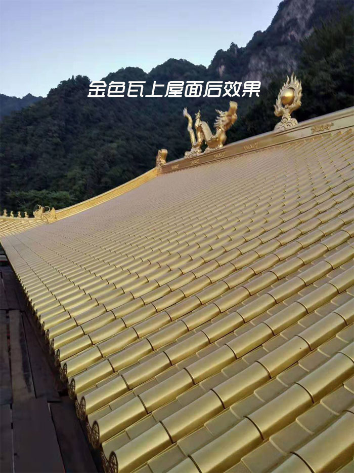從遠處看去,也和普通的金色不同,當太陽曬在上面,會反光,出現,金光閃閃的感覺,更富麗堂皇,契合當下的時代感。因為在生產金色瓦的時候,都會加入一定量分的金粉。