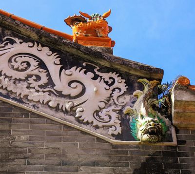 不僅中國宮殿里有這種滴水神獸,越南的順化皇城也毫不例外,在兩處屋頂?shù)慕唤犹帲b飾了一個巨大的龍形滴水神獸,在滿足排水的功能外,在敬畏天地鬼神的年代,其辟邪壓勝的象征意義,還給居住者一種精神上的慰藉。