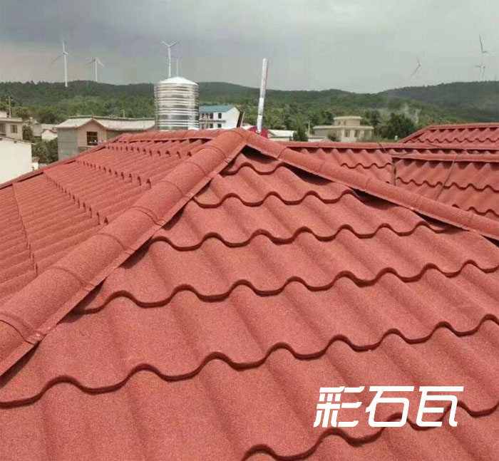 采用高新技術生產的,以防腐性能優異的鍍鋁鋅鋼板為基板,以水性丙烯酸酯為粘合劑,以燒結彩砂為面層,再以耐候性極強的丙烯酸樹脂為最外表層(相當于油漆)的新型高級屋面材料。