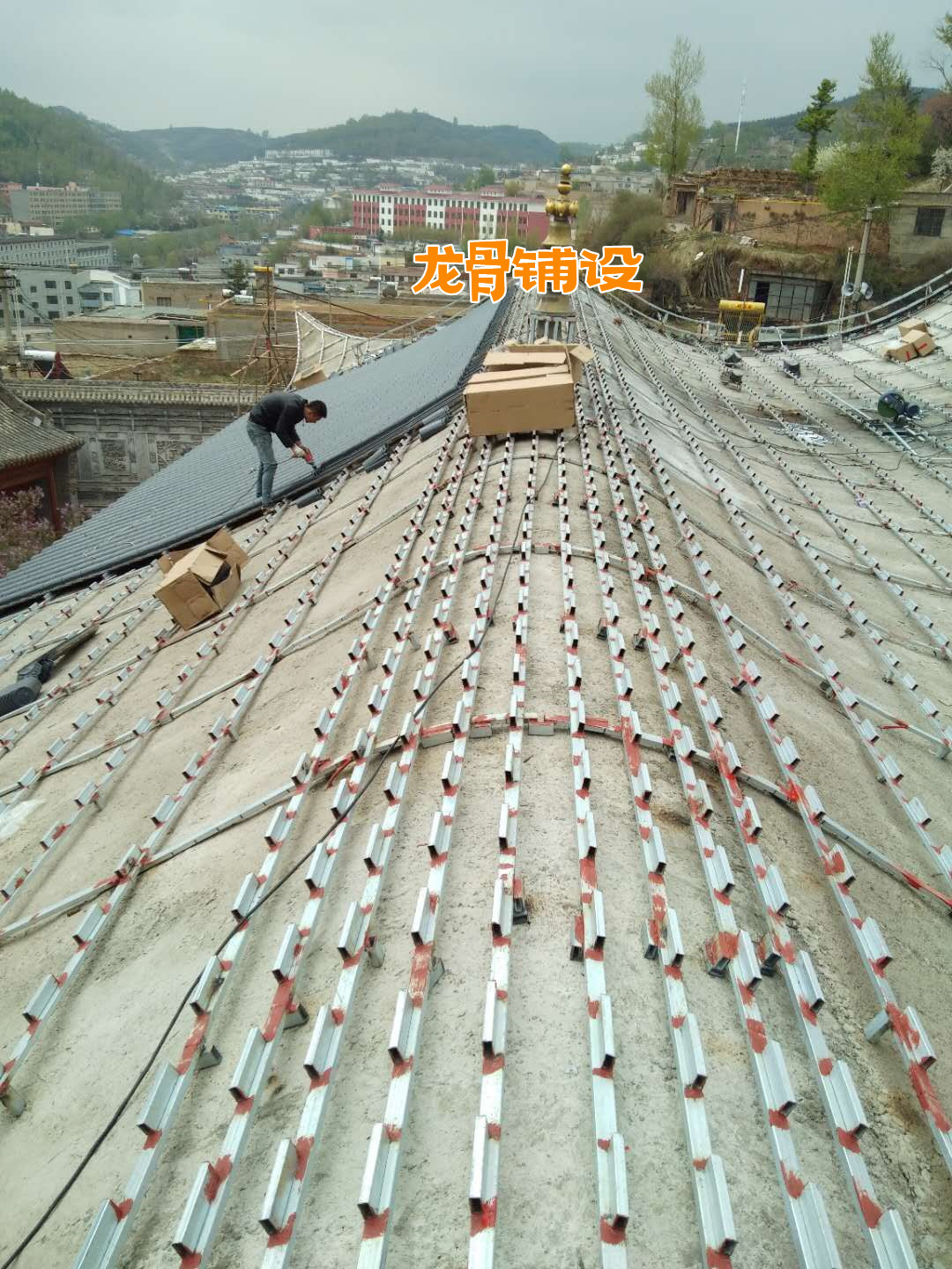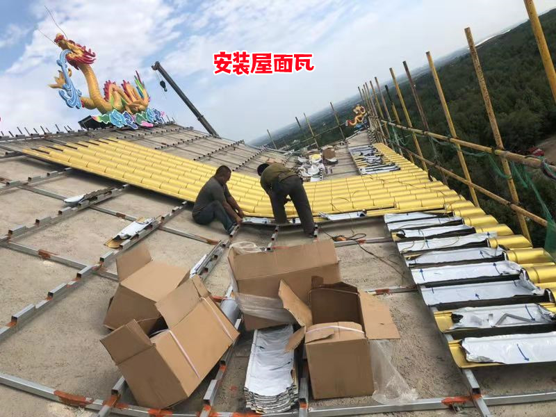 對(duì)于裝瓦這塊的工藝就非常的簡(jiǎn)單,注意好順序即可;因?yàn)辇埞且呀?jīng)焊接好,安裝瓦就更簡(jiǎn)單;瓦安裝需要從屋檐到頂?shù)捻樞騺戆惭b;遇到碰角的位置有當(dāng)溝來替補(bǔ)。屋面瓦的安裝主要工藝是板瓦直接用鉚釘打在次龍骨上,筒瓦用鉚釘打在兩邊的板瓦上,筒瓦與筒瓦是一個(gè)一個(gè)通過卡扣來連接的,板瓦是一個(gè)板瓦搭接一個(gè)板瓦;筒瓦是卡扣連接。