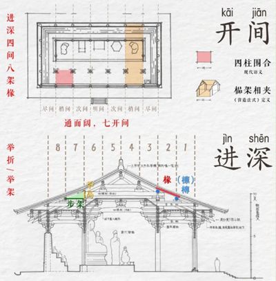 進深:主要是指橫向梁架的深度。通過柱子之間的距離以及梁架椽子的數量來確定“進深”的概念。