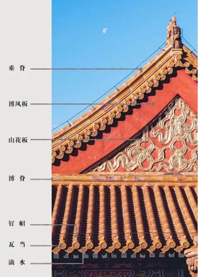 博風板:也叫搏風、搏縫板或封山板,在宋朝時就被稱為博風板。常常用于古代歇山頂和懸山頂建筑中,這些建筑的屋頂兩端會伸出山墻之外。為了抵御風雪,人們用木條釘在檁條頂端,同時它也能起到遮擋桁(檁)頭的作用。