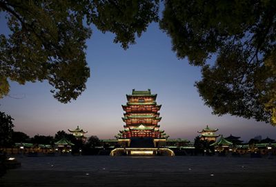 雖然中國古建筑的屋頂形式精美絕倫,但可使用“不照明屋頂,僅設埋地投光方向上打亮屋面下的斗拱和屋身”的照明方式,追求精美輪廓剪影的效果更顯中國傳統建筑藝術的含蓄美。還有些柱廊的建筑,將內測的墻壁照亮,讓外側的構件形成剪影的效果,同樣也富有中國畫的意境。